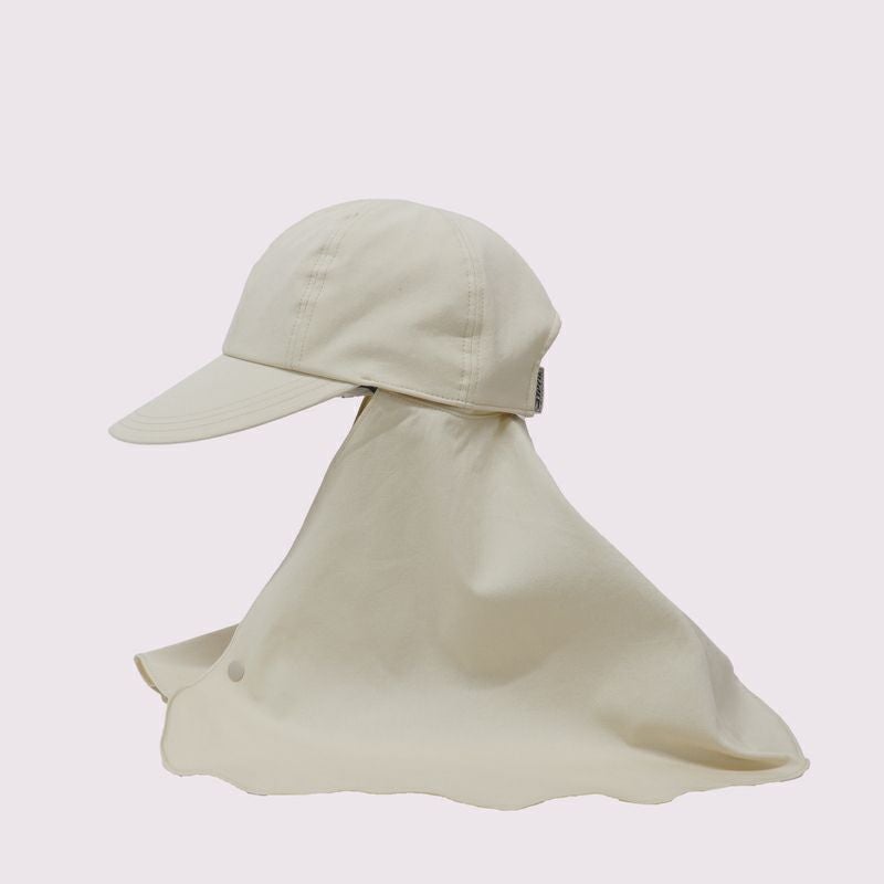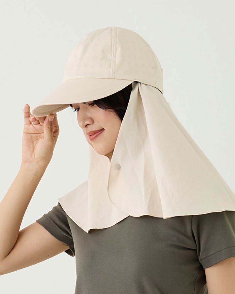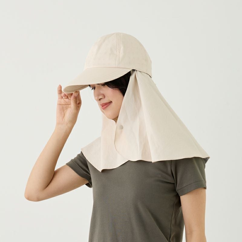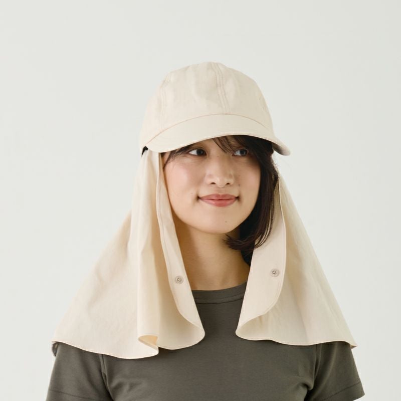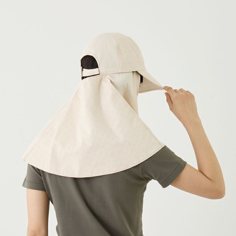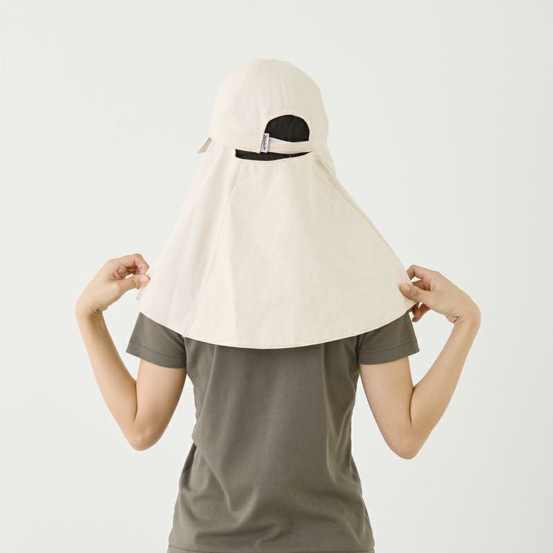 遮熱効果で直射日光から頭と肌を守る「コカゲル」のキャップ。取り外し可能なロングケープ付きで、首もとまでしっかりと守ってくれます。