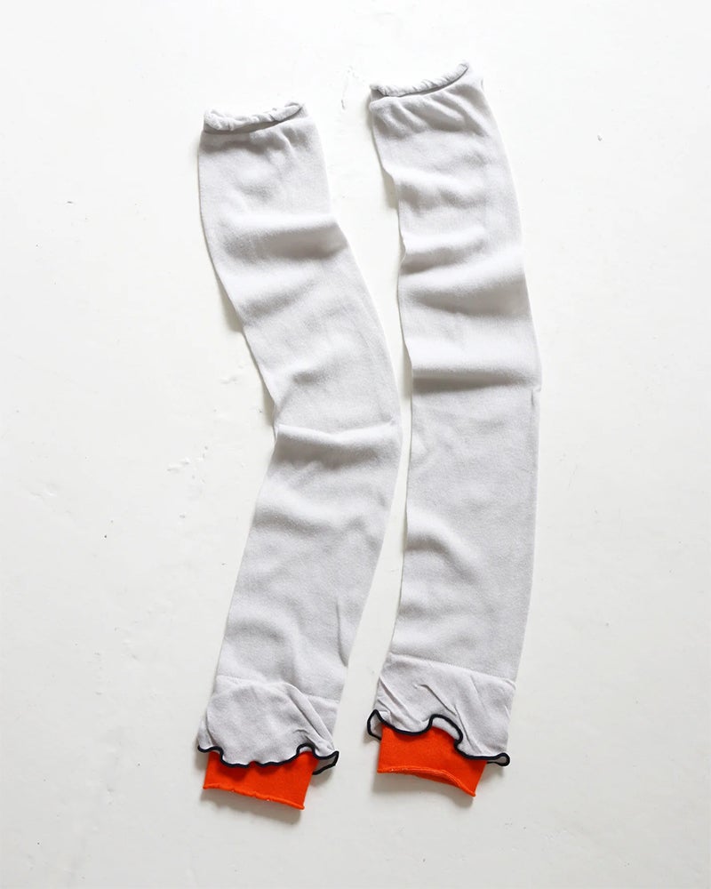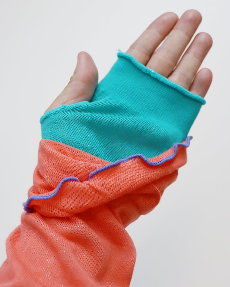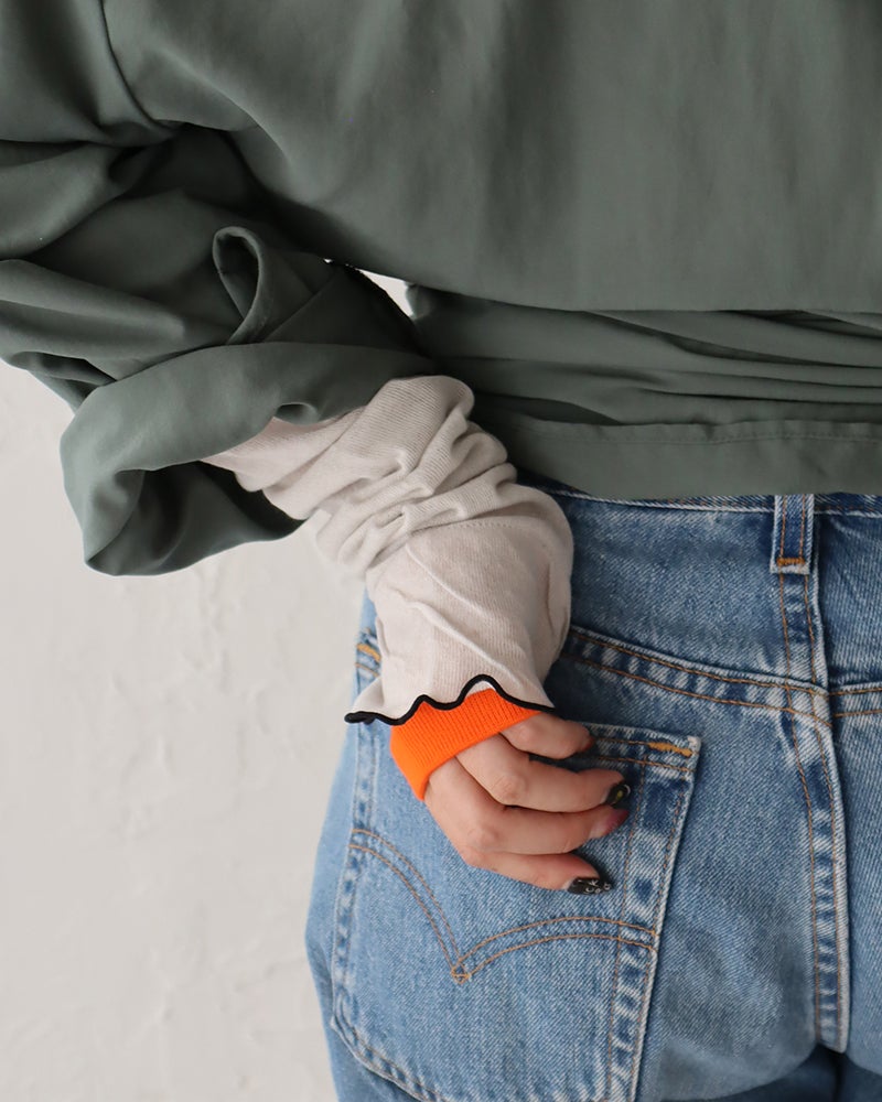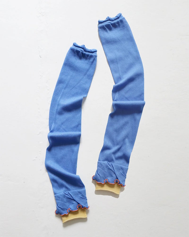 まるでレイヤードスタイルのようなコーデが叶う、チューリップシルエットのアームカバー。鮮やかな色使いで、お洋服に合わせたコーディネートを彩ります。