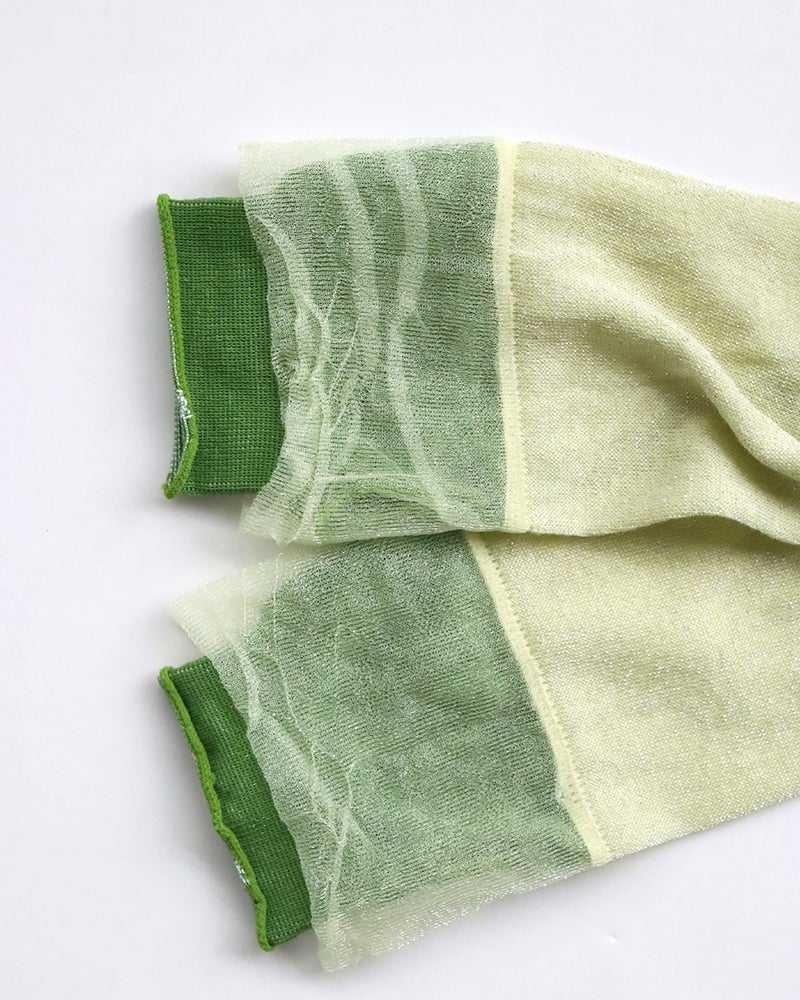 表糸は綿100%の糸を使い、うら糸には滑らかなナイロンの糸を使用してゆったりと編んで作られているので、ぴたっとしすぎず通気性も良く、付け心地も快適。