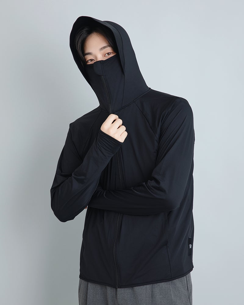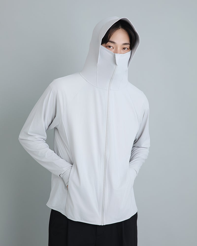 つば付きのフードで顔全体をしっかりとカバー。ファスナーを閉めれば鼻先まで覆えるので、日焼け対策しにくい首元も守ることができます。