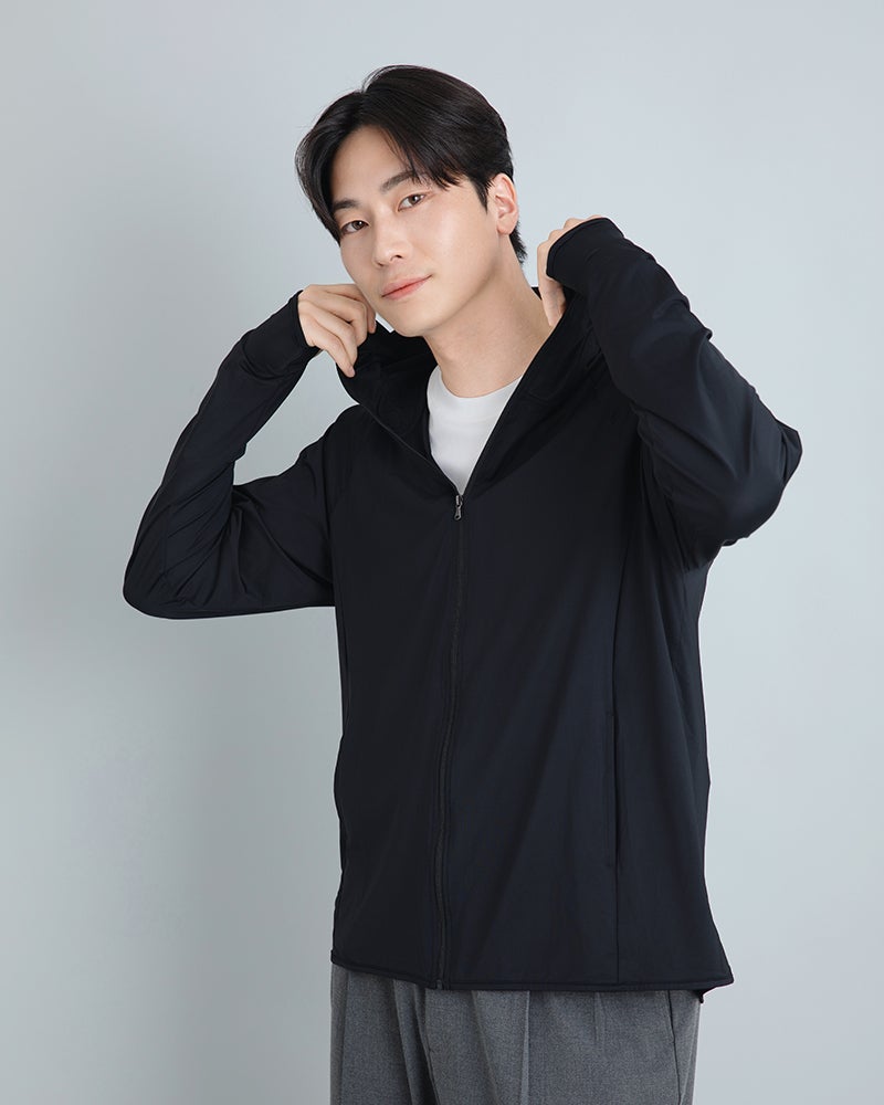 顔周りから指先までカバーできる、ゆったりシルエットのメンズサイズのUVカットパーカー。