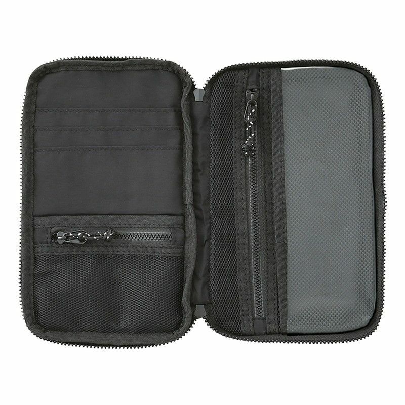 軽量で柔らかなポリエステル素材を使用。大小さまざまなポケットを備え、細かなものを機能的に収納できるマルチケースです。3辺を囲むファスナーのため、フラットに開いて中身をひと目で確認できます。