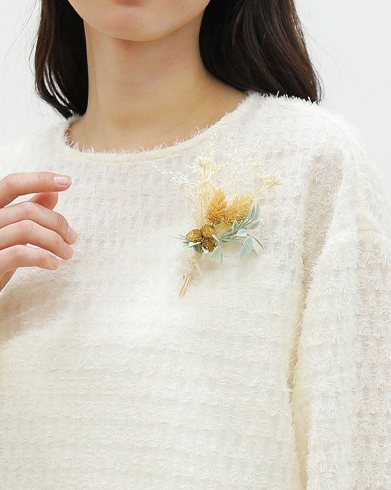 | 使用上の注意 | 天然素材の為、1点1点色合い等が異なります。 また繊細な作りになっておりますのでお取扱いには十分にご注意ください。 高温多湿・直射日光・乾燥した場所を避けて保管をお願い致します。 ドライフラワーの繊維が衣服に付着する場合がございます。色の濃い衣服の場合繊維が目立ちやすい為、着用の際はご注意ください。 |