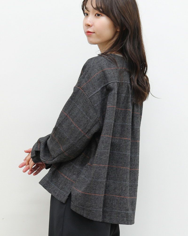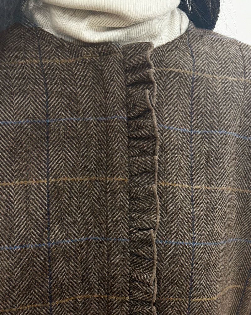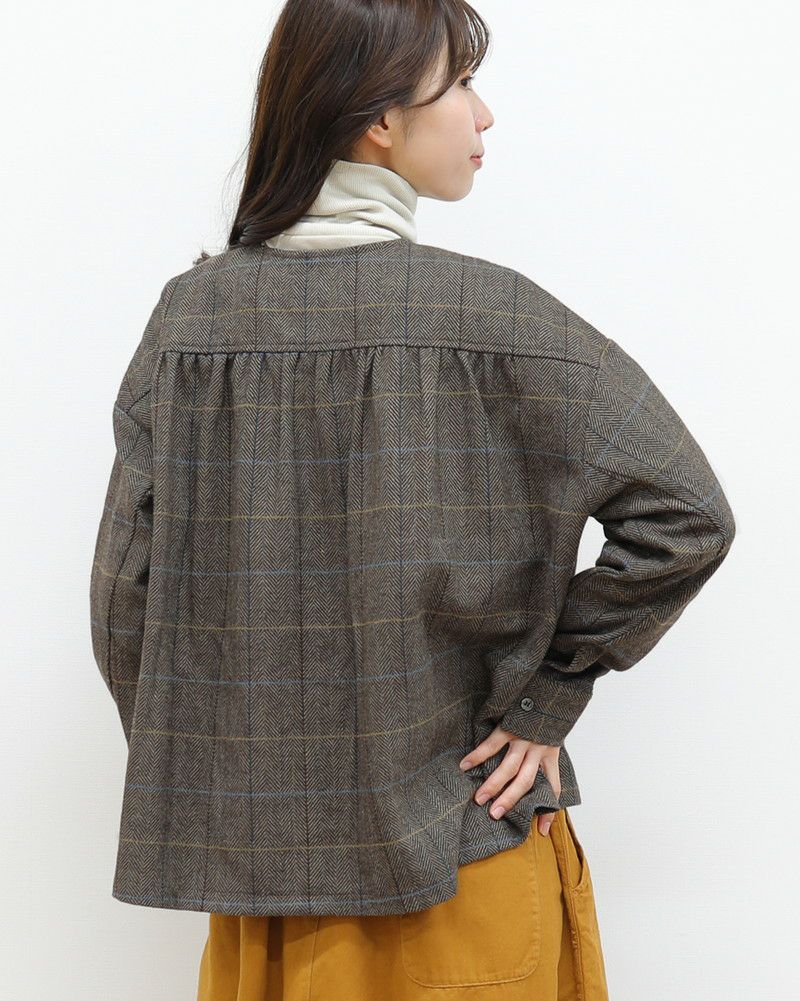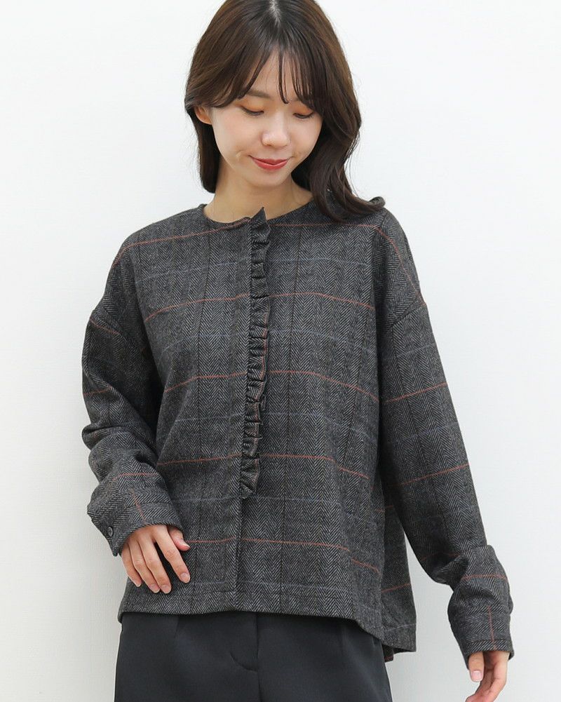 ヘリンボーンチェックでクラシックな印象のクルーネックフリル付きブラウス。ウール特有のふくらみのある風合いと、適度にハリがあるポリエステルのいいとこ取りをした素材で、ブラウスとしてもライトアウターとしても使える便利なアイテムです。