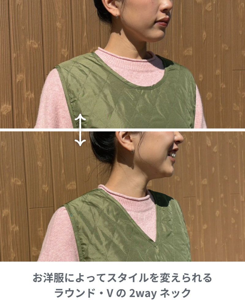 ラウンドネック・Vネックと、お好みで首もとのスタイルを変えられる前後2way仕様。どちらでも着られるよう前後両側に大きめなポケットが付いています。