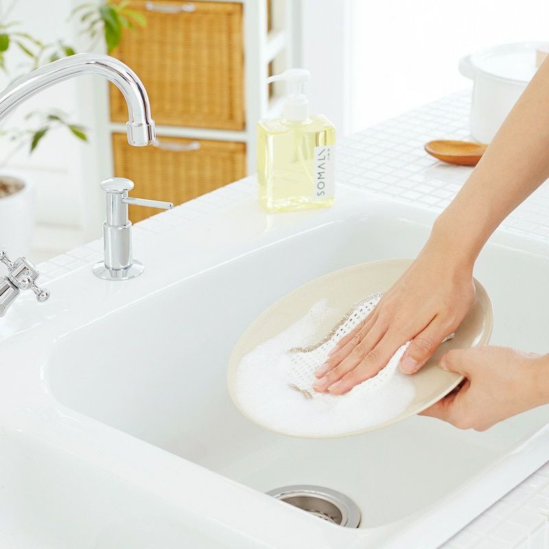 | 使用方法 | スポンジに直接洗剤を付けて、よく泡立てて下さい。石けんの洗浄力をきちんと発揮させるためには、よく泡立てることがポイントです。 泡が消えたら、石けんを足して、すすぎは流水で、なるべくお湯を使っていただくことをおすすめします。酸性汚れとギトギト油は拭き取ってから使用してください。 |