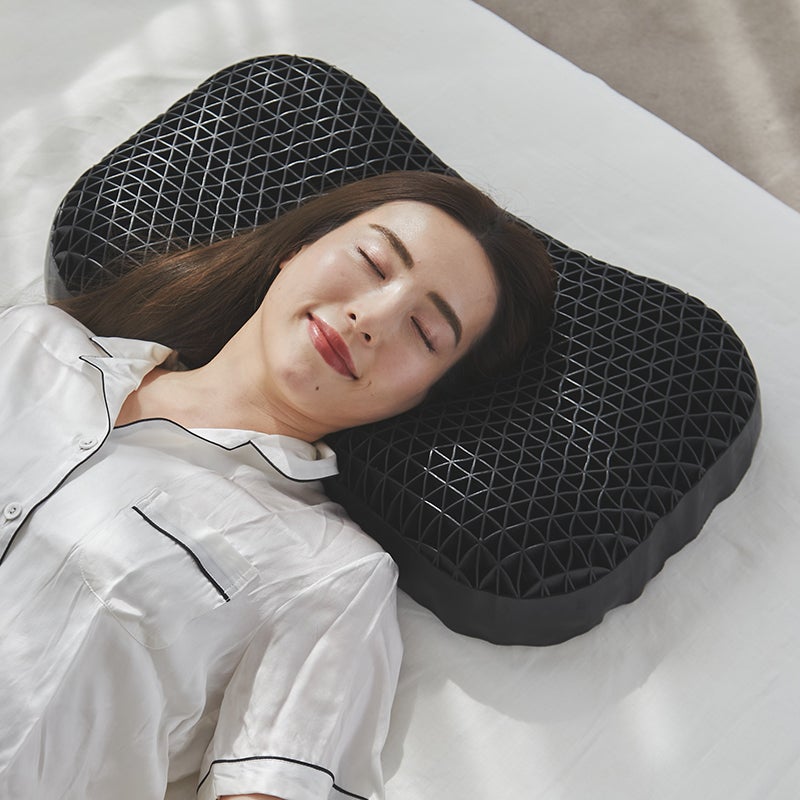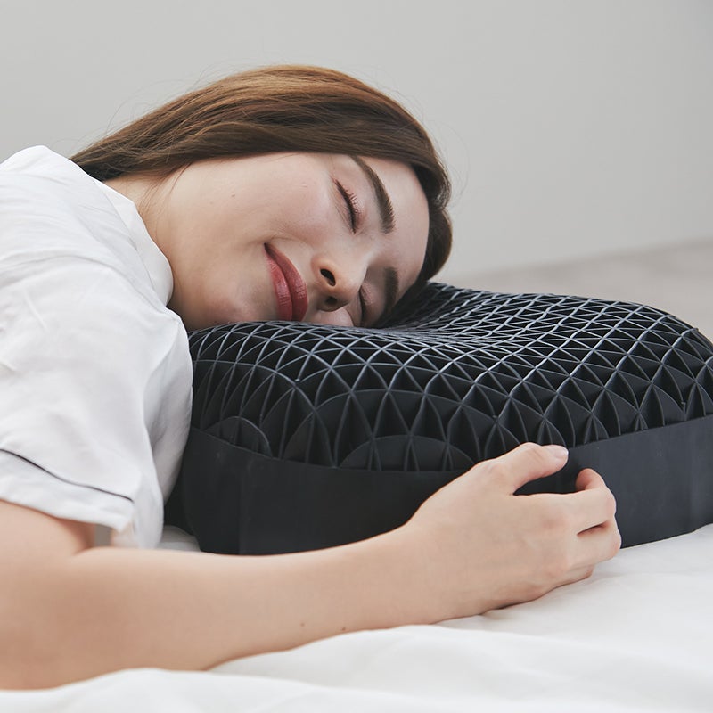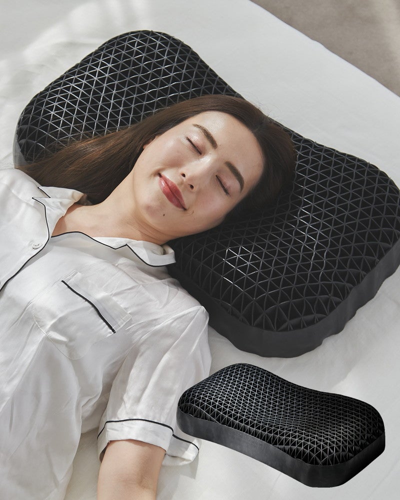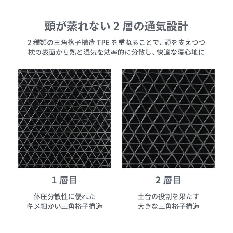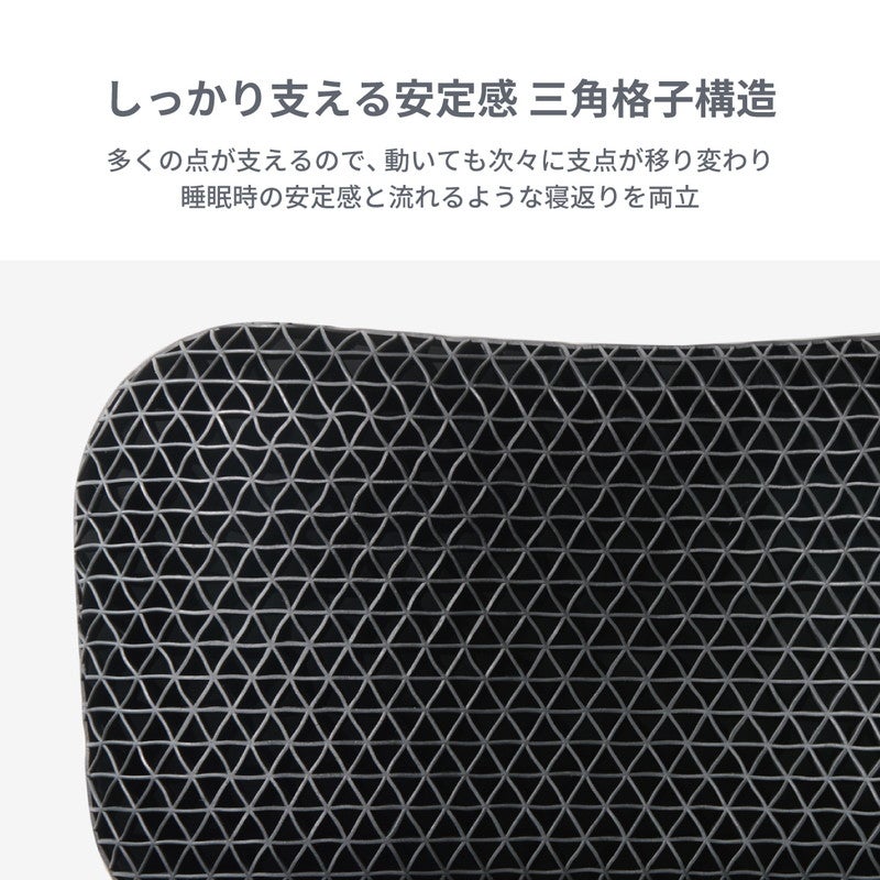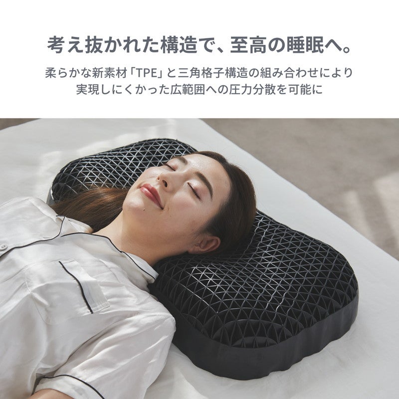 柔らかな新素材「TPE」と三角格子構造の組み合わせにより、実現しにくかった広範囲への圧力分散を可能にし、首や肩の負担を軽減。どんな寝方でも変わらない快適な寝心地を叶えました。