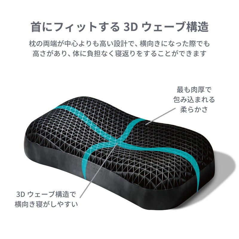 枕の両端が中心よりも高い3Dウェーブ構造で、横向きになった際でも高さがあり、体に負担なく寝返りをすることができます。