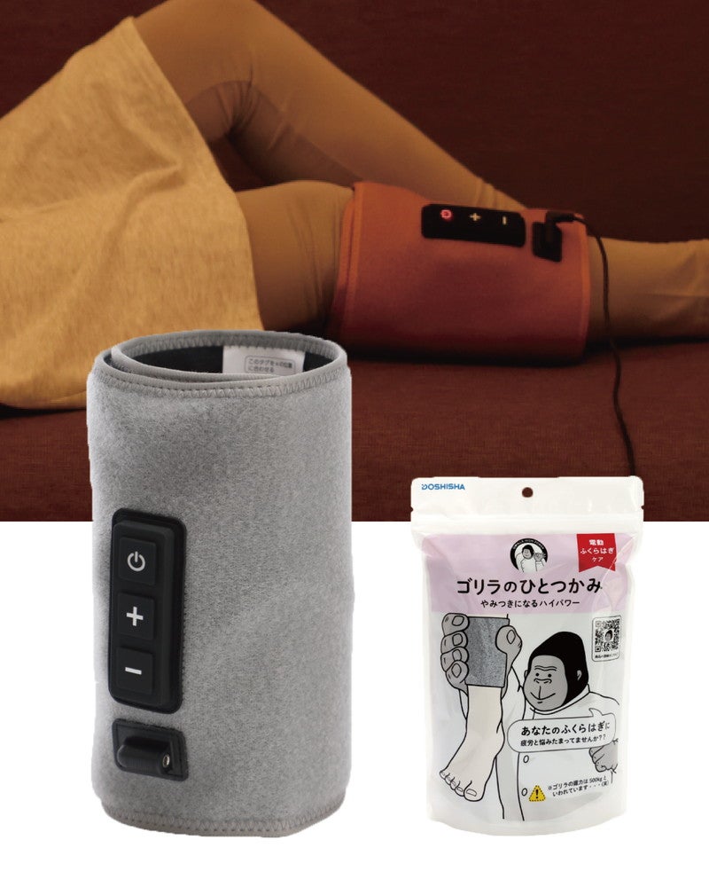 | 使い方 | (1)電源ケーブルをつなぎ、「ぽこぽこパーツ」をセットします (2)取付目印を太ももの裏側に合わせて巻きます (3)電源ボタンを押すとスタート |