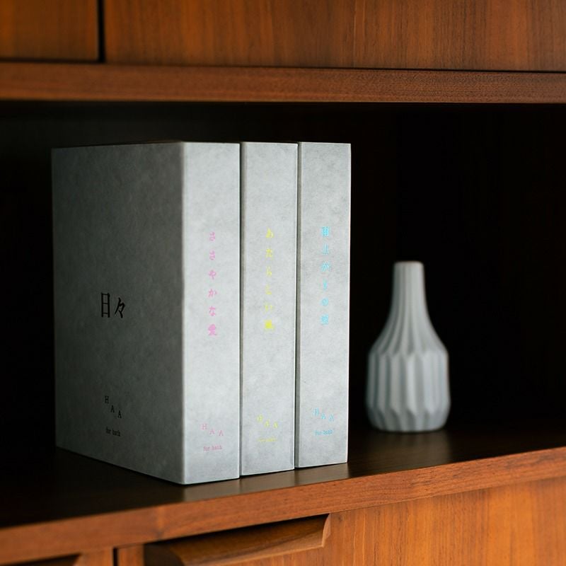 約5回分の「HAA for bath」がセットになった贈りたい気持ちに合わせてテーマを選べる、ことばに包まれた入浴剤。希少な温泉の結晶「別府湯の花」を使用し、ミネラル成分が豊富なお湯でずっと身体がポカポカに。
