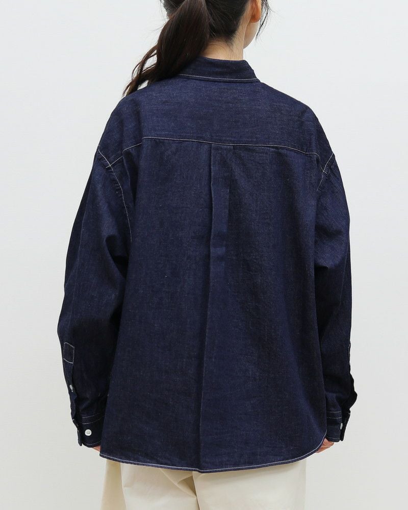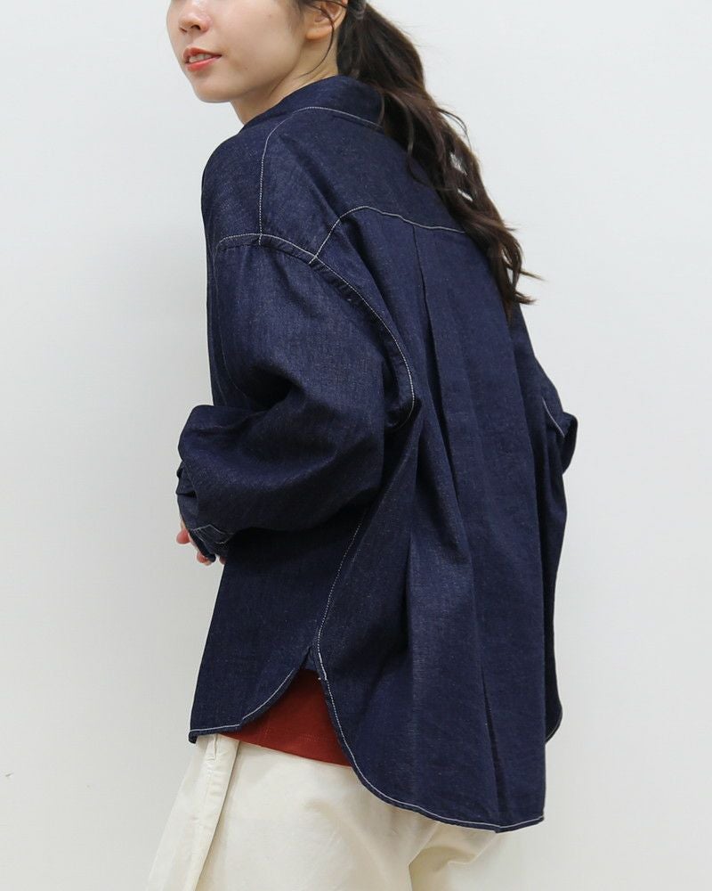 密度のある生地ですが、しなやかさを併せ持ったデニム素材で、サイドに入ったスリットや、刻印入りのボタンなど細部にこだわり、1枚で着ても様になるボックスシルエットです。