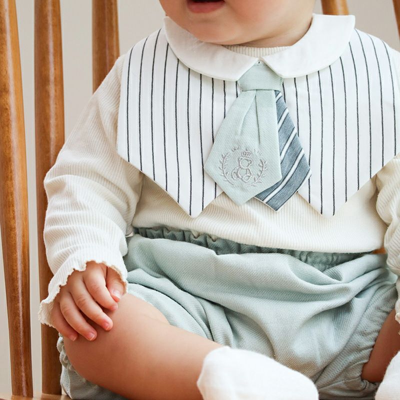 きちんと感のあるデザインのスタイは、ネクタイにあしらったテディベアの刺繍がポイントになっています。