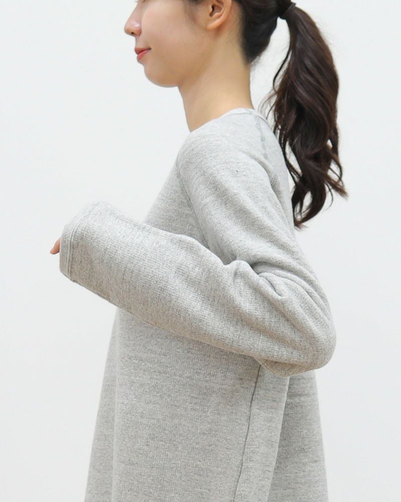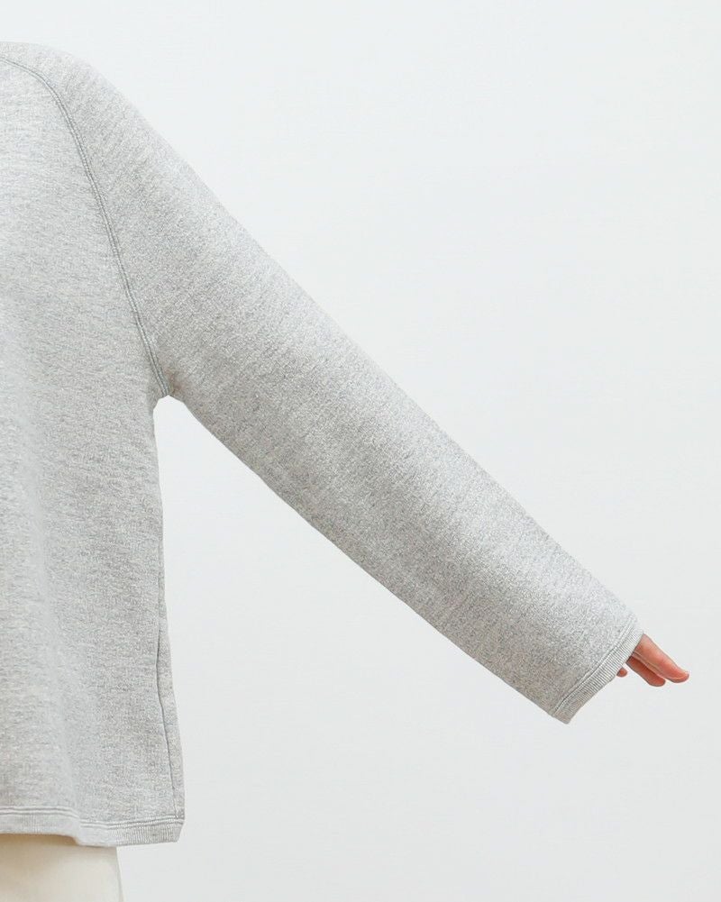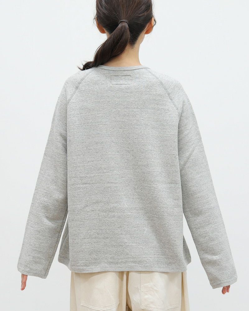 裏毛仕上げの柔らかな風合いのスウエット。身幅にゆとりをもたせているので、一枚で着るのはもちろん、シャツやカットソーをレイヤードしたスタイルを楽しめます。ラグラン仕立てなので、重ねても腕回りが動かしやすいのもうれしいポイントです。