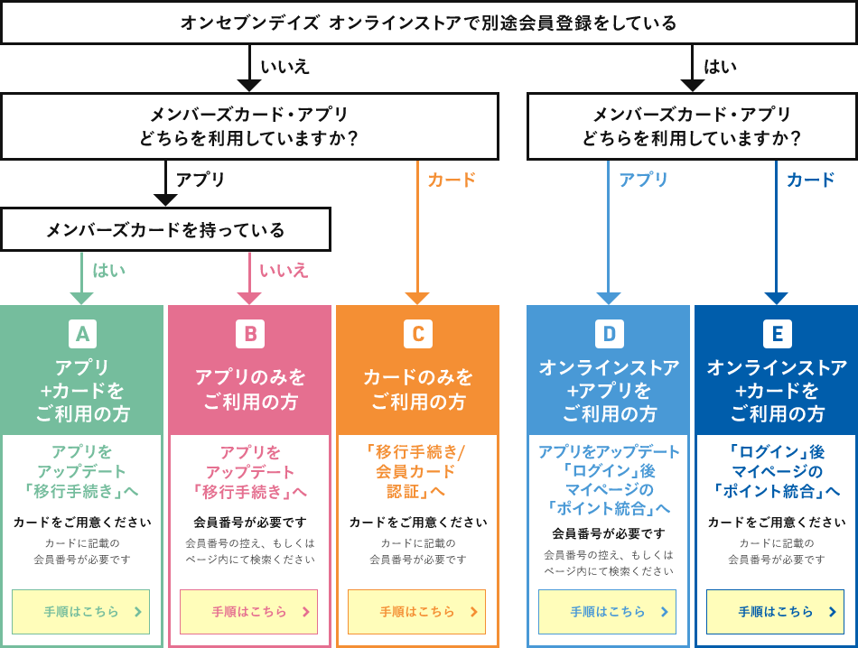 新サービスへの移行手続きが必要です。お手数をおかけしますが以下のフローチャートを参考に該当の手続きをお願いします。※移行後は、オンセブンデイズオンラインストアにご登録いただいた情報が、お客様の会員情報となります。