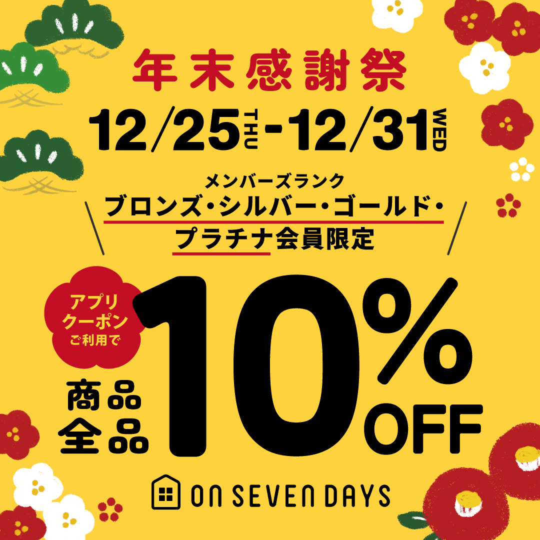 あす12/25(木)から12/31(水)までの期間中、対象のお客様のオンセブンデイズアプリ内に「年末感謝祭10%OFFアプリクーポン」が表示されます。