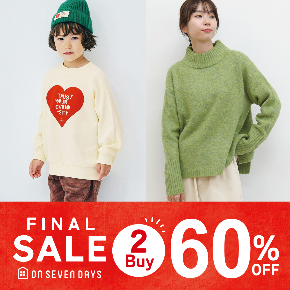 冬物レディースファッション&キッズ50%OFF商品を2点以上購入で60%OFFとさらにプライスダウン!