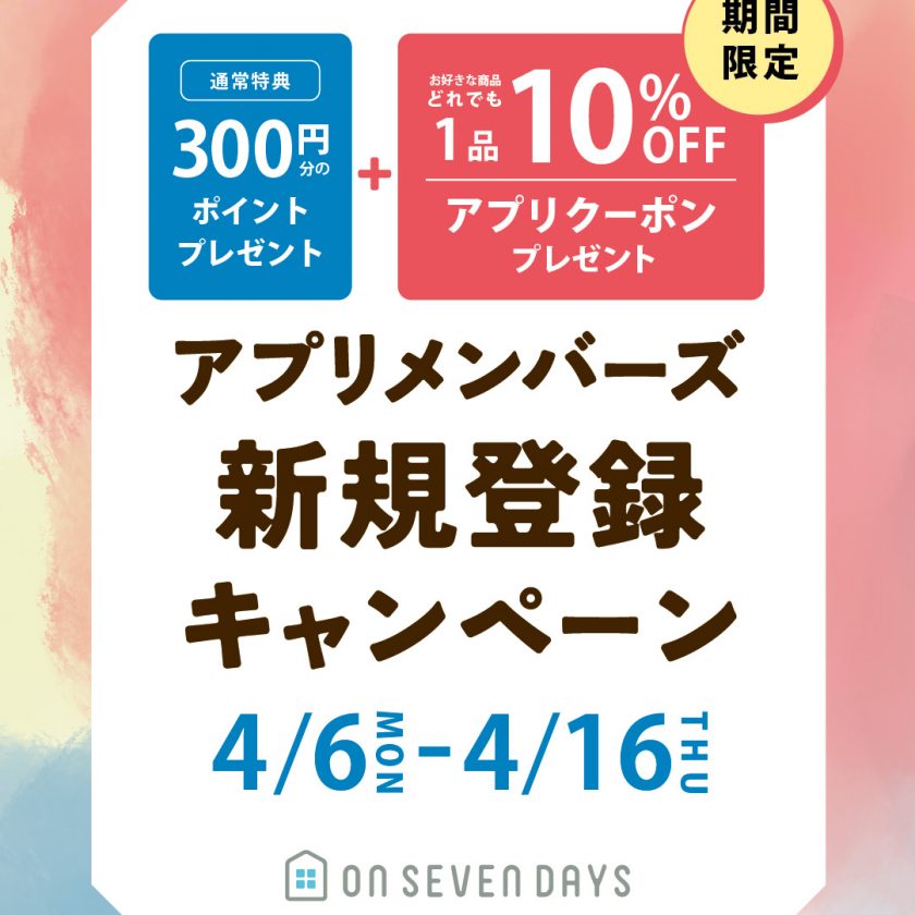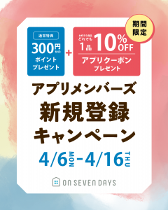 期間中、オンセブンデイズアプリにて新規会員登録をすると、すぐに使える[お好きな商品1品10%OFF]アプリクーポンを差し上げます。