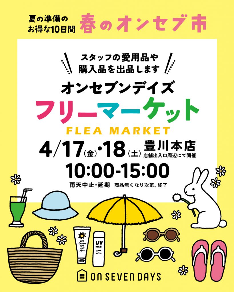 オンセブンデイズ豊川本店・如意申店・半田店にて雑貨のフリーマーケットを開催します。