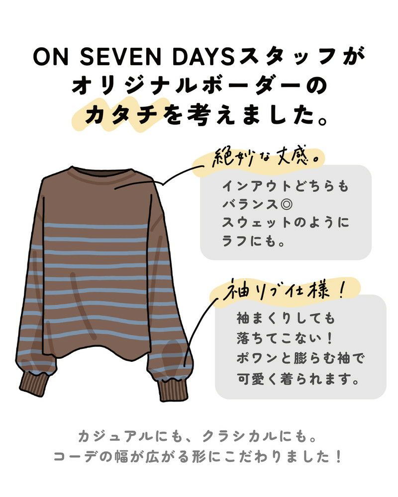 他の画像を見る [ON SEVEN DAYS]スタッフプロデュース パネルボーダーギャザー袖プルオーバー 定番カラー/オンセブンデイズ オンセブンデイズ限定 販売価格 ¥ 6,490 税込 (0) カートに入れる お気に入りに登録する